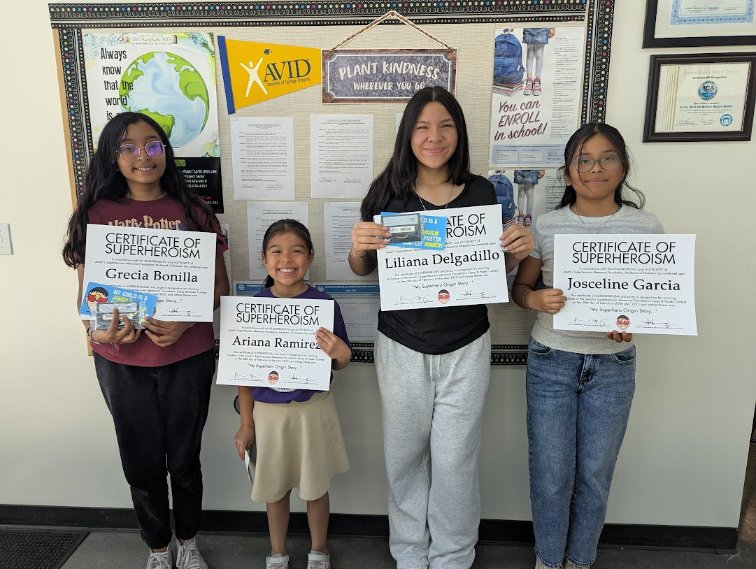 On February 28, 2025, we also sponsored the 6th Annual Superheroism Essay and Poster contest for kids to take time to reflect on what it means to be a superhero in Jonah’s honor. This year’s theme was ‘My superhero origin story’, and pictured are the winners at Jonah’s home school, Cortez Mathematics and Science Magnet School: Winners were awarded gift cards and certificates for their excellent efforts.