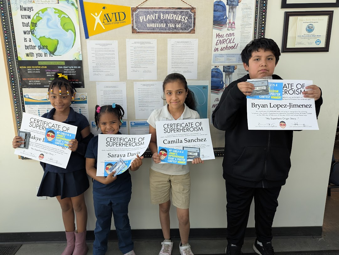 On February 28, 2025, we also sponsored the 6th Annual Superheroism Essay and Poster contest for kids to take time to reflect on what it means to be a superhero in Jonah’s honor. This year’s theme was ‘My superhero origin story’, and pictured are the winners at Jonah’s home school, Cortez Mathematics and Science Magnet School: Winners were awarded gift cards and certificates for their excellent efforts.